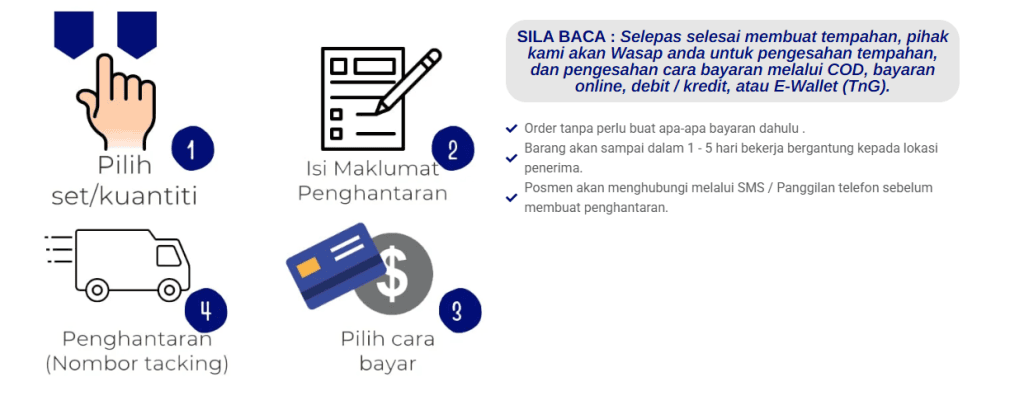 SILA BACA: Selepas selesai membuat tempahan, pihak kami akan hubungi anda untuk mengesahkan tempahan dan cara bayar secara COD atau bayaran online